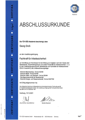 Die TÜV SÜD Akademie hat auf qualitativ sehr hochwertigem Niveau Kenntnisse über Betriebsärzte, Sicherheitsingenieure und Unfallverhütung vermittelt. Dank dieser intensiven und sehr guten einjährigen Ausbildung wird der seit 2019 tätige Georg Gross das Tätigkeitsfeld Arbeitssicherheit der Krieg & Fischer Ingenieure GmbH mit seinem Wissen und Know-how bereichern.